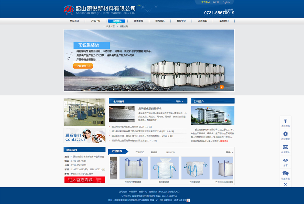 韶山蘅銳新材料有限公司,成立于2011年,專業(yè)生產集裝袋、編織袋,生產基地位于湖南省韶山市高新區(qū)創(chuàng)業(yè)基地,緊鄰韶山市行政中心,距潭邵高速出口1公里,交通十分便利;公司擁有國內先進拉絲機組4臺套,大圓織機 15臺,吊帶機20臺縫紉機150臺,以及完善的檢測設備。生產車間18000平方米,員工300人,集裝袋年生產能力200萬條,編織袋年生產能力1000萬條。