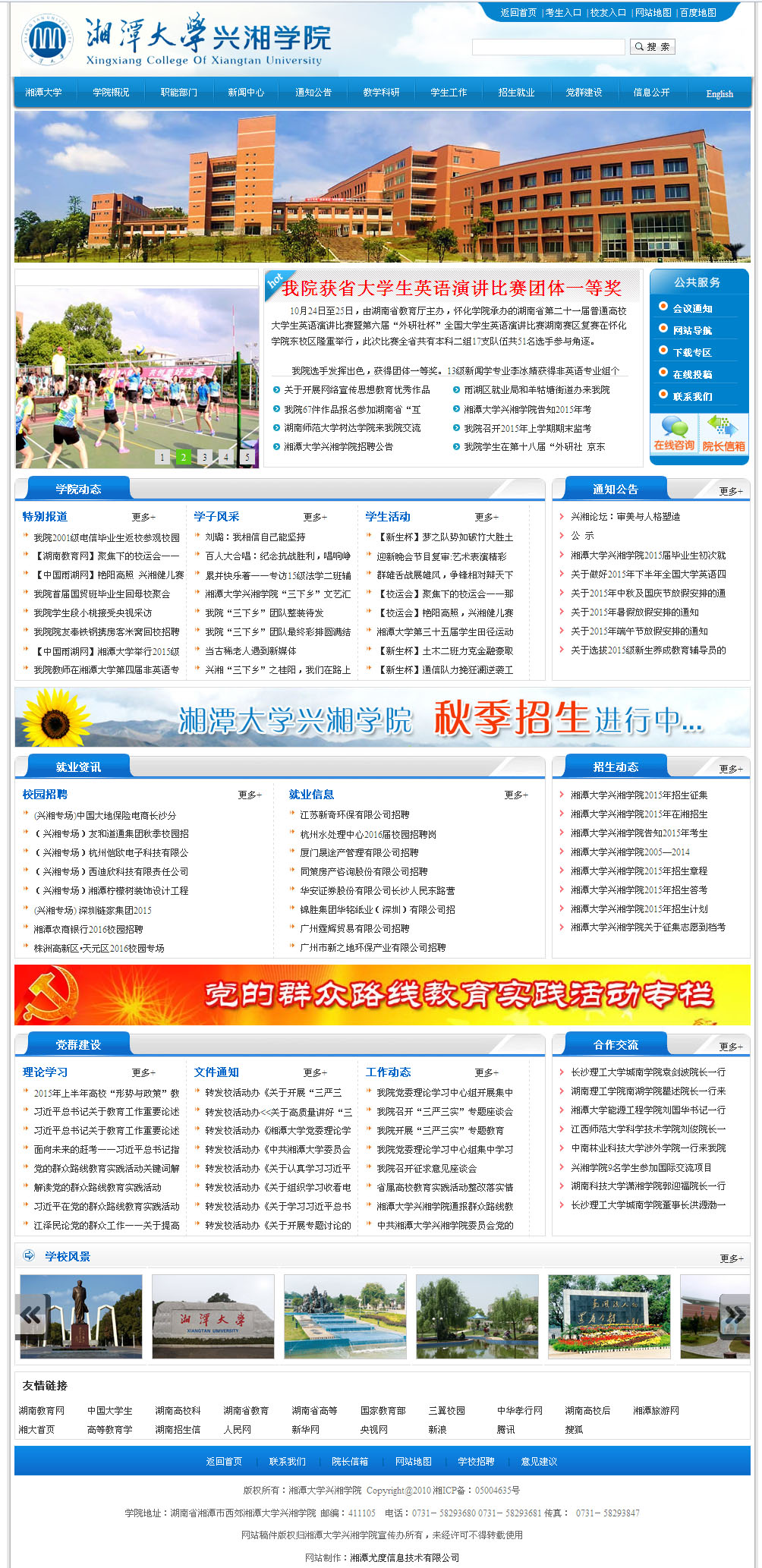 此網(wǎng)站是專為湘潭大學(xué)興湘學(xué)院設(shè)計(jì)的營(yíng)銷型網(wǎng)站,網(wǎng)站以藍(lán)色為主,采用營(yíng)銷型標(biāo)準(zhǔn)定制,突出了學(xué)校的重點(diǎn)欄目。網(wǎng)站欄目清晰大方,為湘潭大學(xué)興湘學(xué)院獲得了優(yōu)秀教育網(wǎng)站二等獎(jiǎng)。