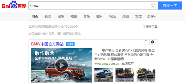 1.域名要盡量簡短,這樣可以方便記憶。比如我是空調(diào)行業(yè),那么我申請的域名是 kongtiao.com,這樣的域名屬于行業(yè)域名,比如我的品牌名字叫KS,那么我的域名叫做KS.com,這樣的域名都是好域名。下面我們就舉個例說明:比如寶馬的域名BMW,都知道這是寶馬的主題標(biāo)志,或者直接說別摸我,這樣的域名非常好,和企業(yè)主題相呼應(yīng)。甚至有大量的人直接用BMW來搜索寶馬相關(guān)信息,如圖: